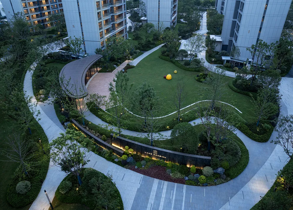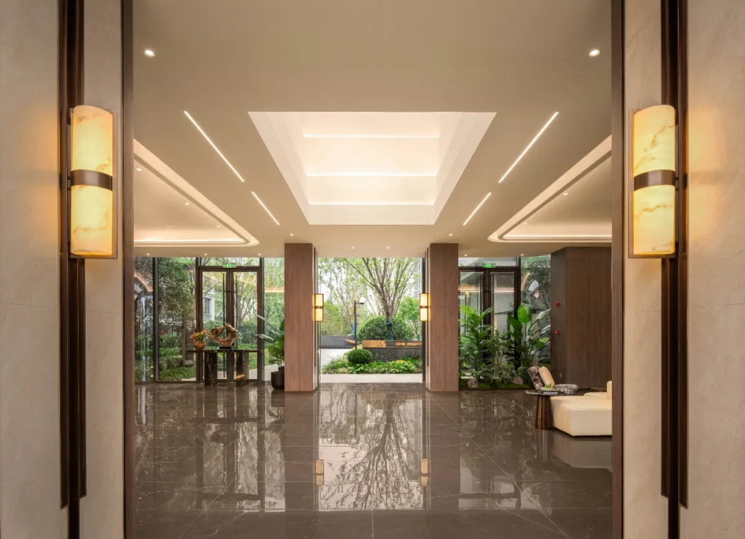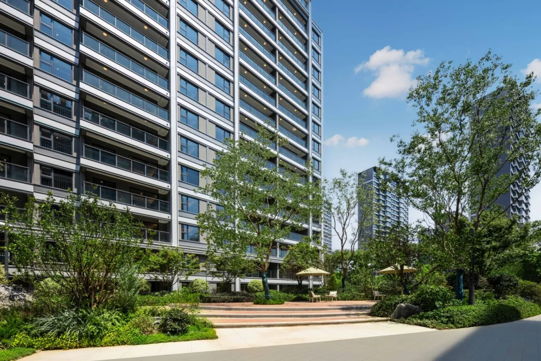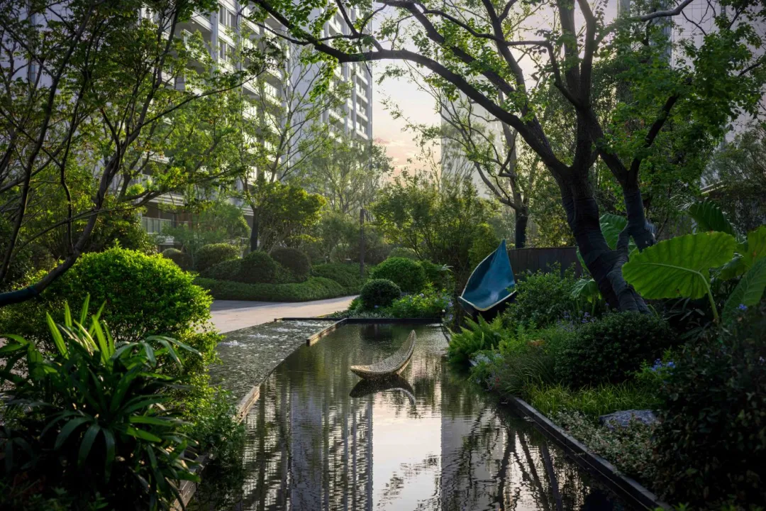 門為迎,入口皆蘊涵迎送儀序;水為樂,迎賓水景淙淙入耳;庭為和,花園層見疊出,林下停留休憩;園為趣,安靜風景之外,亦見友鄰溫情;堂為逸,地上流線式屋檐,地下精裝入戶大堂。繁華入靜,步履不停,游走其間,身定心安。