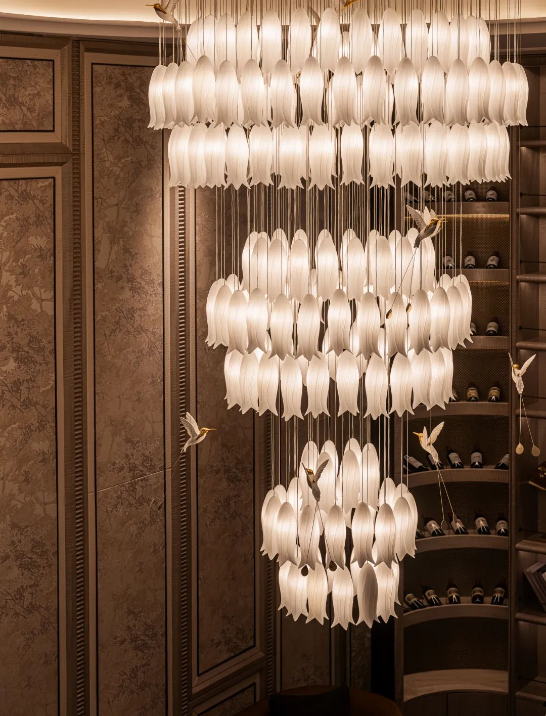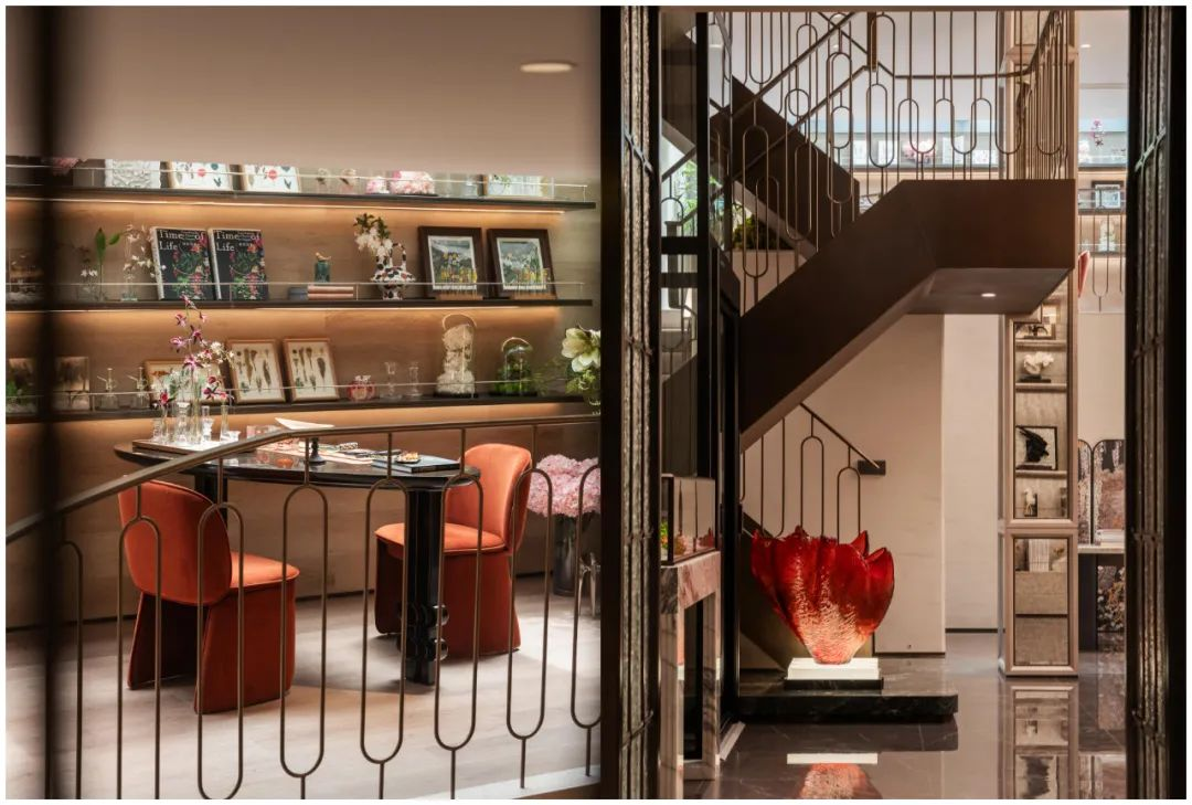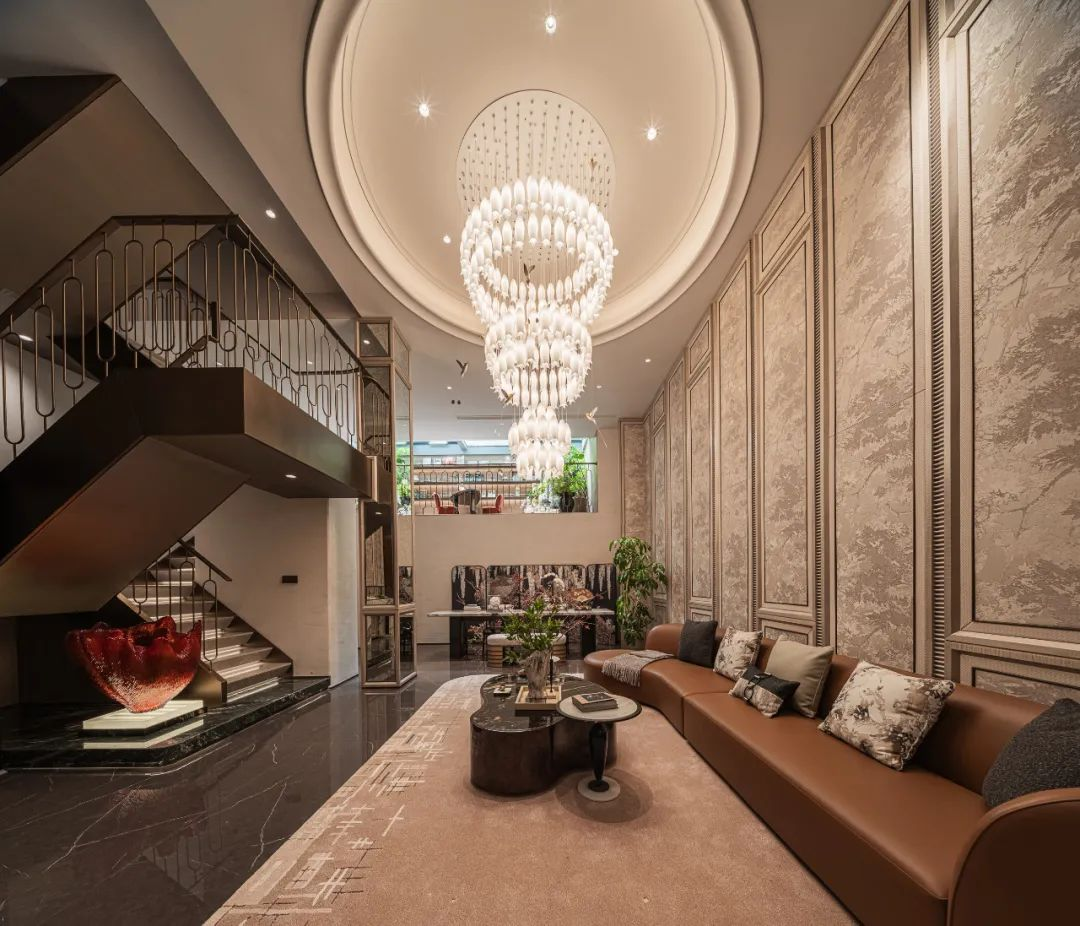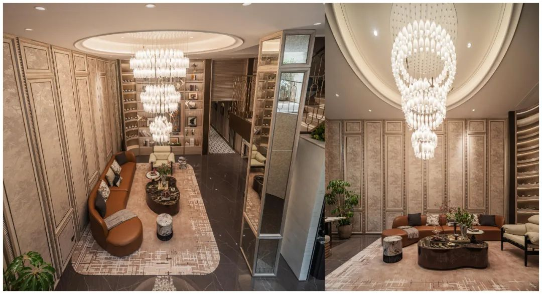 下沉式會(huì)客廳,引入光線,以約5.1米挑高釋放縱向尺度,營(yíng)造奢闊排場(chǎng),通過動(dòng)態(tài)模塊串聯(lián)聚會(huì)、觀影、品酒等功能,打造高階私藏會(huì)所,匹配城市高凈值人群的社交需求。