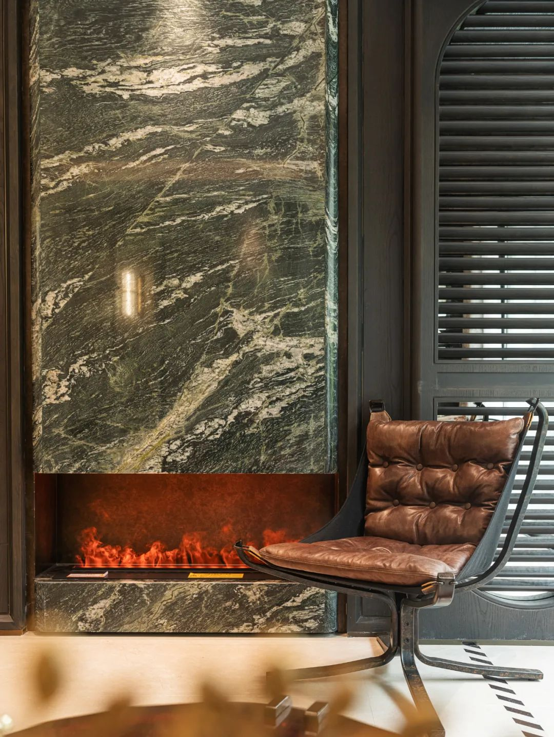在材質(zhì)的臻選上,【Geek Chic】樣板間使用大理石,溫潤(rùn)玉石和金屬碰撞,佐以自然的木、石和皮革做調(diào)和,各司其職,流露質(zhì)感的慵懶腔調(diào)。