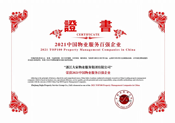 在行業集中度加速提升、競爭日益白熱化的當下,大家服務集團憑借著持續成長的業務規模、不斷豐富的業務形態以及堅定不移的服務初心,連續4年蟬聯“2021中國物業服務百強企業”,排名較2020年提升6位;同時榮獲“2021中國紅色物業服務優秀企業”稱號。
