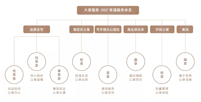 在業務規模持續激增、業務范疇不斷延伸、外部環境復雜變化的背景下,大家服務進行了一系列的體系升級,建立以住宅服務、案場服務、商寫服務、綜合體服務、市政共建等業態細分的“360°幸福服務體系”,打造優享家、悅享家、尊享家三大標準服務體系。