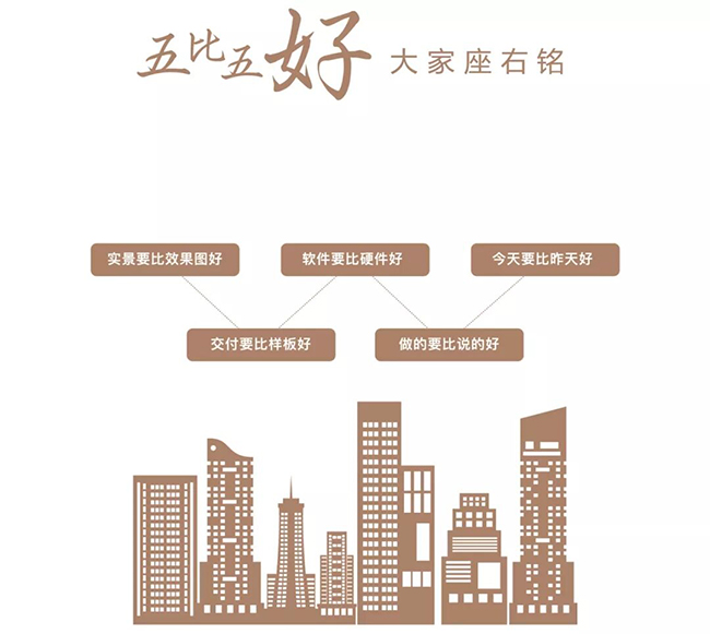 做企業(yè),如做人,企業(yè)的品牌特征如同人之秉性。大家房產(chǎn)以品質(zhì)為金名片,以良好的品性和摯誠(chéng)奉獻(xiàn)來(lái)推動(dòng)城市發(fā)展和居住品質(zhì)的提升。“五比五好”持續(xù)推動(dòng)大家房產(chǎn)在發(fā)展運(yùn)營(yíng)、產(chǎn)品營(yíng)造、服務(wù)提升等維度的前行,是企業(yè)發(fā)展的立身之本和理想之源。