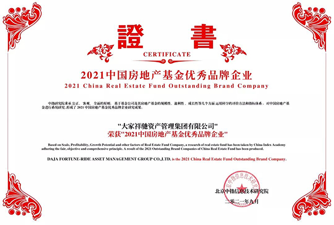 同時(shí),集團(tuán)旗下全資子集團(tuán)“大家祥馳”,憑借深厚的沉淀及專(zhuān)業(yè)的投資及資產(chǎn)管理能力,榮膺“2021中國(guó)房地產(chǎn)基金優(yōu)秀品牌企業(yè)”。