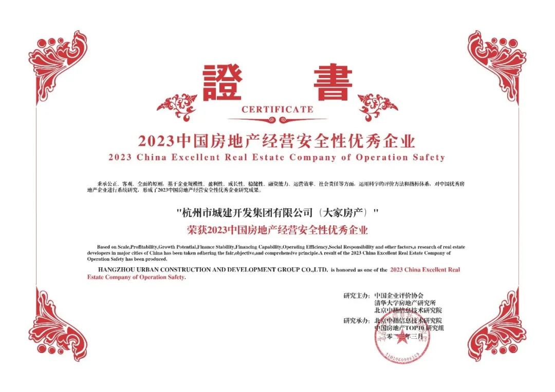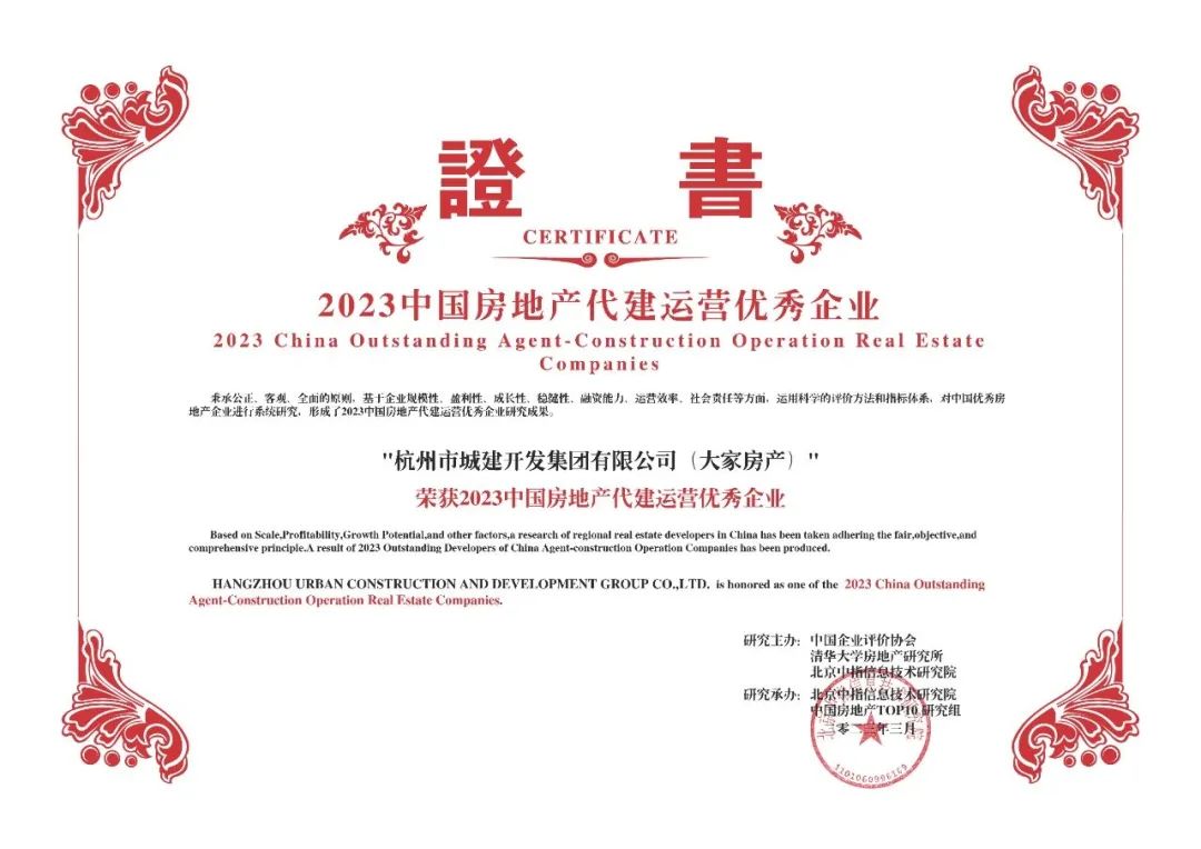 ???? 同時,在“做輕”戰略指引下,展現企業代建領域實力,榮膺“2023中國房地產代建運營優秀企業”稱號;且大家房產經營穩健,以“杭派精工”品質打磨產品,深度參與城市公建,榮獲“2023中國房地產經營安全性優秀企業”、“2023中國房地產產品力優秀企業”、“2023中國房地產城市更新優秀企業”。