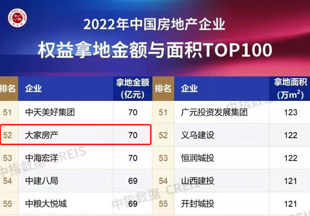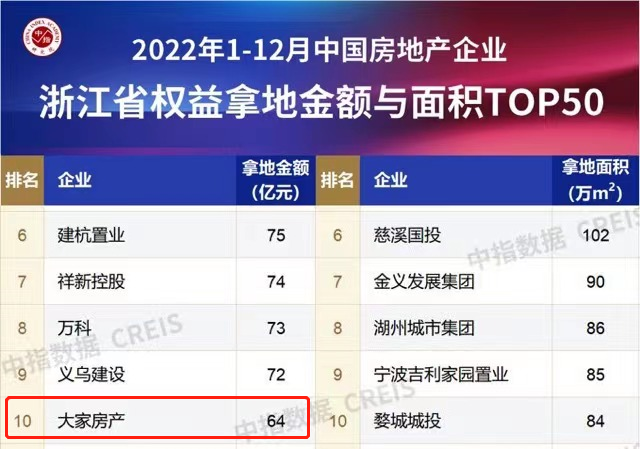 ???? 基于這樣的理念,2022年大家房產在拿地市場交出了一份滿意答卷。在中指研究院權威發布的2022年中國房地產企業權益拿地金額與面積TOP100中,其權益拿地金額70億,位列第52位,而在2022年浙江省權益拿地金額與面積排行榜中,其權益拿地金額位列第10位,充分了展現企業綜合實力。