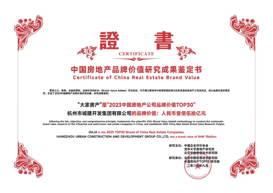 2023年9月14日,由中國企業(yè)評價協(xié)會、清華大學(xué)房地產(chǎn)研究所、北京中指信息技術(shù)研究院主辦,北京中指信息技術(shù)研究院中國房地產(chǎn)TOP10研究組承辦的“2023中國房地產(chǎn)品牌價值研究成果發(fā)布會暨第二十屆中國房地產(chǎn)品牌發(fā)展論壇”在北京隆重召開。憑借核心高能級城市的有質(zhì)深耕、細(xì)節(jié)匠心的品質(zhì)交付以及多元綜合營造能力,杭州市城建開發(fā)集團(大家房產(chǎn))蟬聯(lián)“2023中國房地產(chǎn)公司品牌價值TOP30”和“2023中國房地產(chǎn)顧客滿意度領(lǐng)先品牌”。