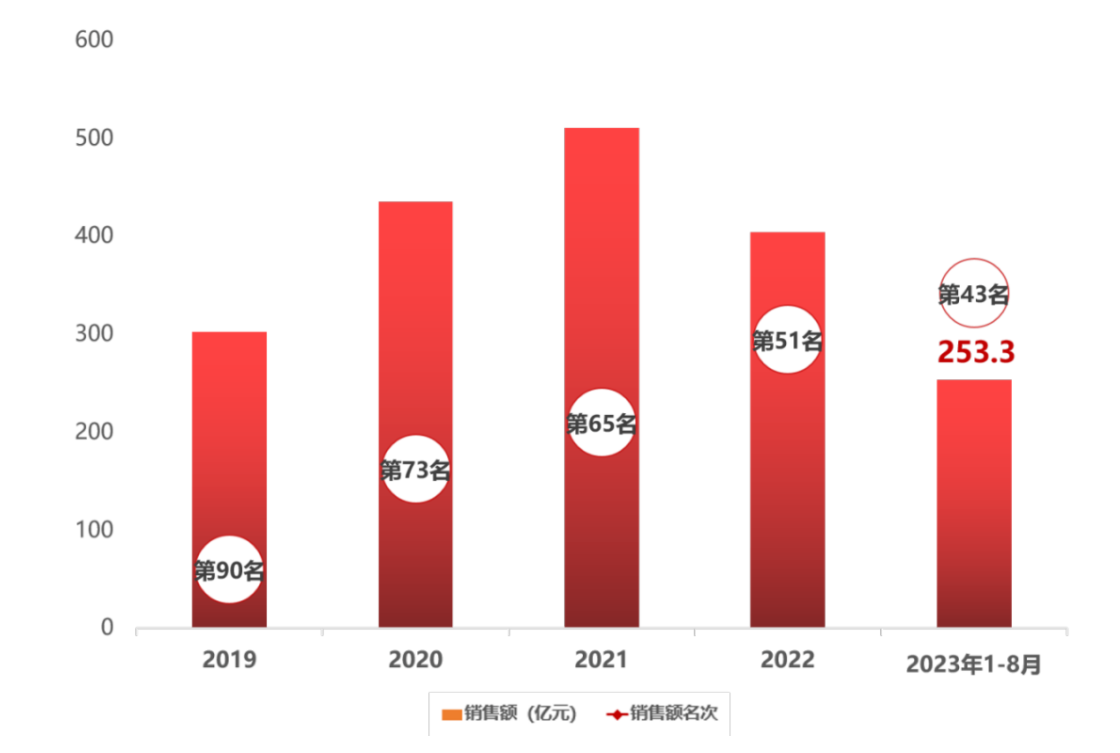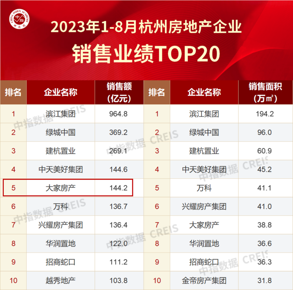 2023年1-8月,大家房產(chǎn)實現(xiàn)銷售金額253.3億元,名次逐年提升,在中指研究院權(quán)威發(fā)布的“2023年1-8月中國房地產(chǎn)企業(yè)銷售業(yè)績排行榜”中位居第43位。在大本營杭州,大家房產(chǎn)2023年1-8月銷售額144.2億元,在杭州房地產(chǎn)企業(yè)銷售業(yè)績排行榜中位列第5位。