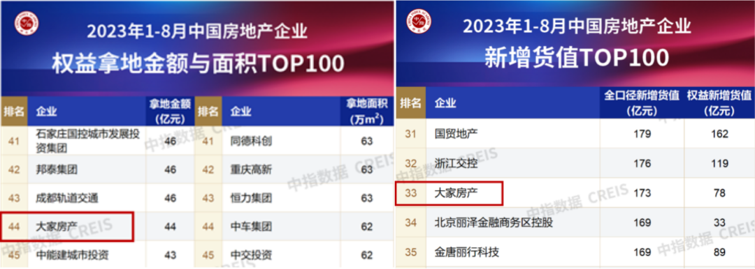 截至今年8月,大家房產(chǎn)新獲項目主要集中布局于杭州、上海和蘇州,在中指研究院發(fā)布的“2023年1-8月中國房地產(chǎn)企業(yè)權(quán)益拿地金額與面積排行榜”中,權(quán)益拿地金額位列第44位,全口徑新增貨值位列第33位。