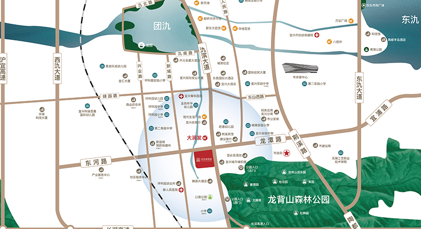 氿瓏雲起,擇址宜興環科園龍背山森林公園旁,總建筑面積約8.06萬方,容積率約1.6,由9棟14-18層小高層組成,建筑面積約136-153㎡,部分公建化立面,景觀采用雙軸線和圍合布局,為業主營造舒適社區環境,打造宜興城南封面作品。