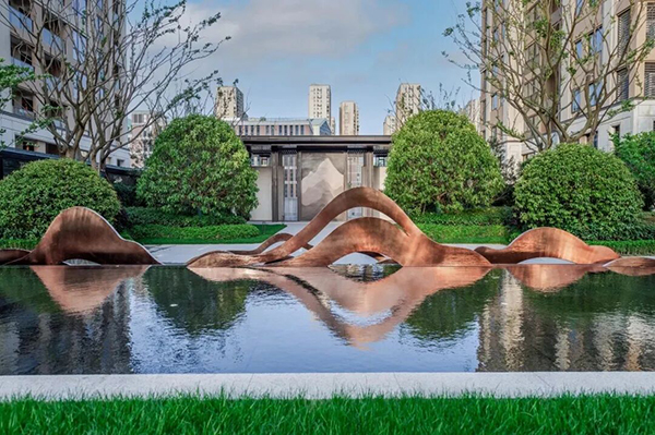 園區景觀設計規劃五重禮序空間,“門、堂、廳、園、院”次第鋪陳,從園區大門進入,映入眼簾的是波光粼粼的水景、頗有氣勢的門樓構架,還有文化感濃厚的雕塑屏風。再往里深入,廊亭、戶外會客廳,以及四季合宜的植物……每一處都像在歡迎家人,營造出歸家的滿滿儀式感。