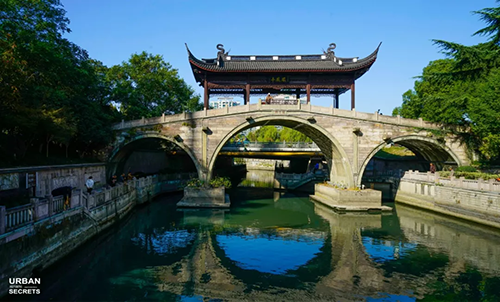 ▲中河鹽橋上的慶余亭,鹽橋又名惠濟(jì)橋、廣福橋、聯(lián)橋,曾是中河上名頭最響的橋。這里曾是中河上鹽船靠岸的碼頭,古時(shí)鹽船多聚泊于此。橋東南有徽州弄、嚴(yán)州弄,就是當(dāng)時(shí)徽嚴(yán)兩幫鹽商的聚居處。
