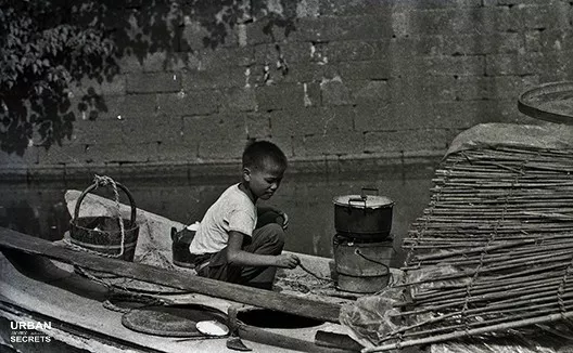 ▲1978年左右,杭城東河,菜市橋河下的農(nóng)船和農(nóng)船上的桐鄉(xiāng)孩童。章勝賢攝影。