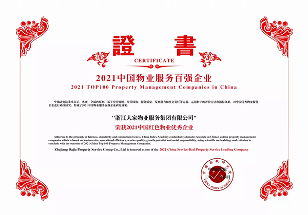 在行業集中度加速提升、競爭日益白熱化的當下,大家服務集團憑借著持續成長的業務規模、不斷豐富的業務形態以及堅定不移的服務初心,連續4年蟬聯“2021中國物業服務百強企業”,排名較2020年提升6位;同時榮獲“2021中國紅色物業服務優秀企業”稱號。