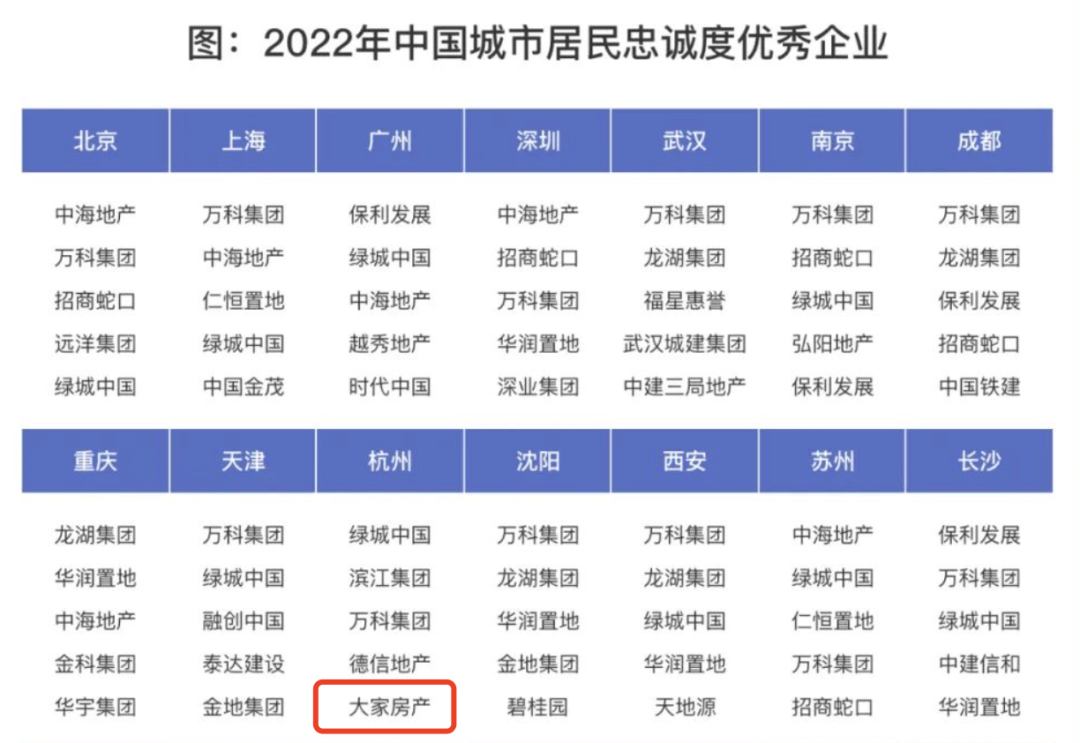近日,中指研究院發布了2022年中國房地產居民居住滿意度普查成果。在杭州“2022重點城市居民居住滿意度優秀企業”和“2022重點城市居民居住忠誠度優秀企業”排名中,大家房產分別位列第4名與第5名,以高標準的“美好社區”服務,贏得了家人和行業的認可和尊重。