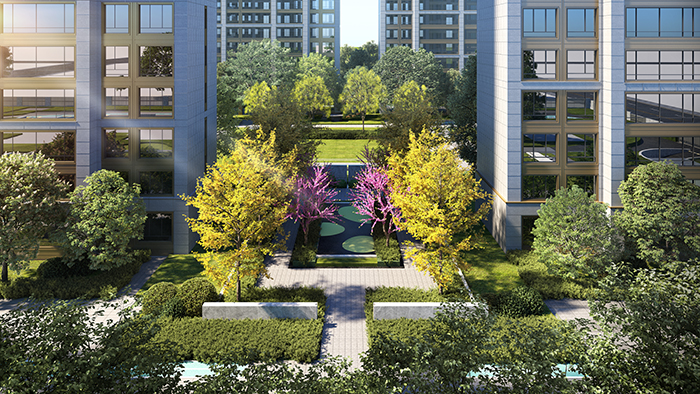 項(xiàng)目整體建筑風(fēng)格采用現(xiàn)代風(fēng)格,立面由玻璃與裝飾一體板的搭配組成,線條明了、簡(jiǎn)約大氣。大立面設(shè)計(jì)采用三段式布局,在簡(jiǎn)潔明快的基礎(chǔ)上,整體色調(diào)以淺色為主,通過(guò)細(xì)致豐富的小尺度立面金屬線條、通透的玻璃面與石材或仿石材一體板的簡(jiǎn)潔飾面,營(yíng)造干練精致的現(xiàn)代風(fēng)格。主入口以酒店式入口大堂作為遞進(jìn)式歸家的開篇體驗(yàn),利用景觀手法劃分不同的功能活動(dòng)空間,并引入Tiffany系列產(chǎn)品,打造一幕幕劇場(chǎng)式生活場(chǎng)景,增加景觀的實(shí)用互動(dòng)功能,營(yíng)造人與自然共融的戶外時(shí)尚美學(xué)會(huì)客廳,提供戶外會(huì)客、藝術(shù)展覽、party聚會(huì)的室外空間。
